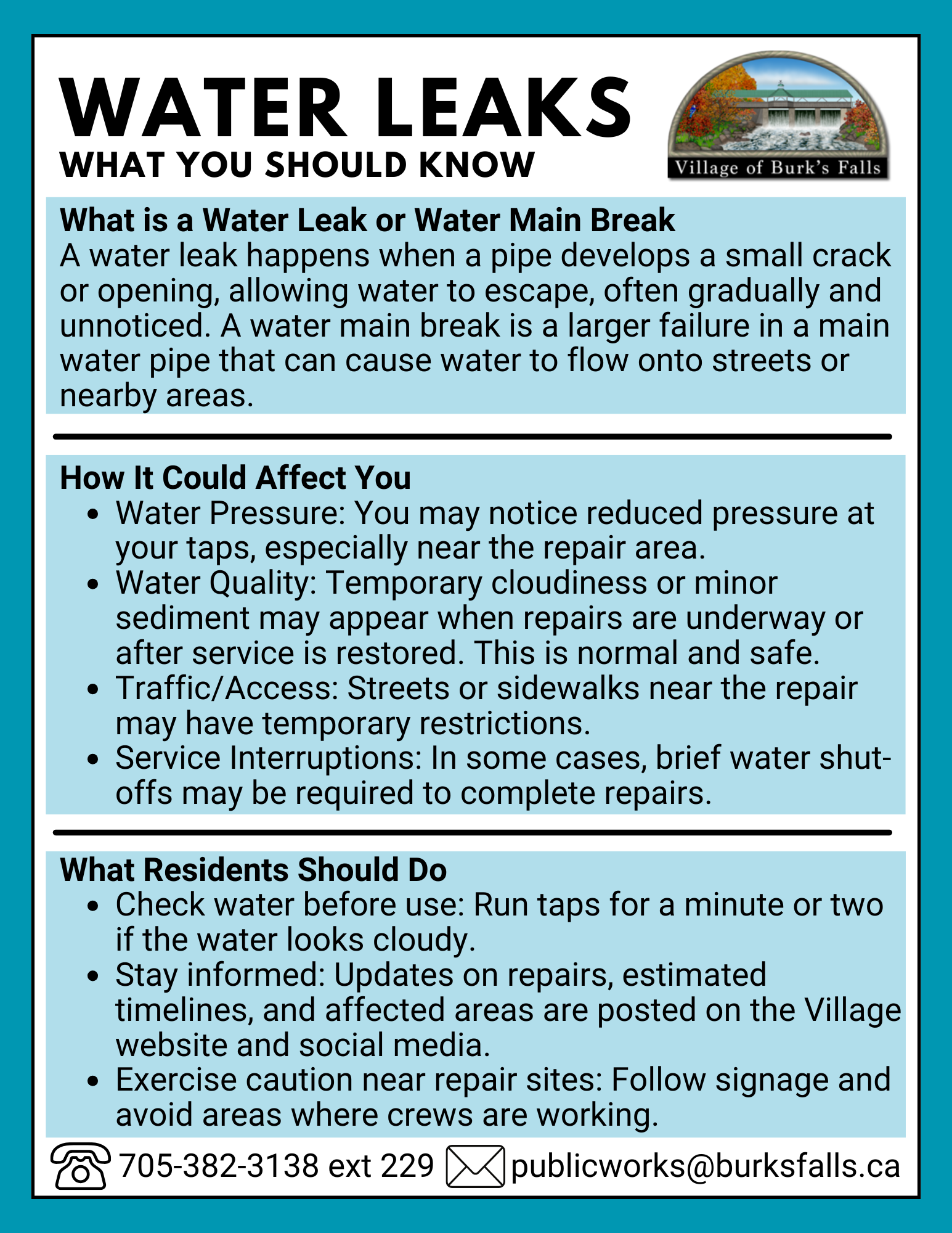 From time to time, water leaks or water main breaks may occur within the Village’s water distribution system. When this happens, the Village of Burk’s Falls Public Works Department responds quickly and efficiently while maintaining all required safety and regulatory standards. Residents may notice temporary service interruptions, reduced water pressure, or Public Works crews working in the affected area.
