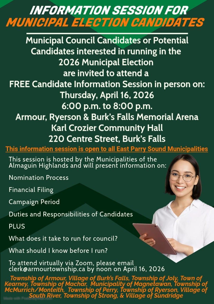 At least once the Clerk shall advertise the Notice of Nomination in the Almaguin News and municipal website. April 14th, 2022.